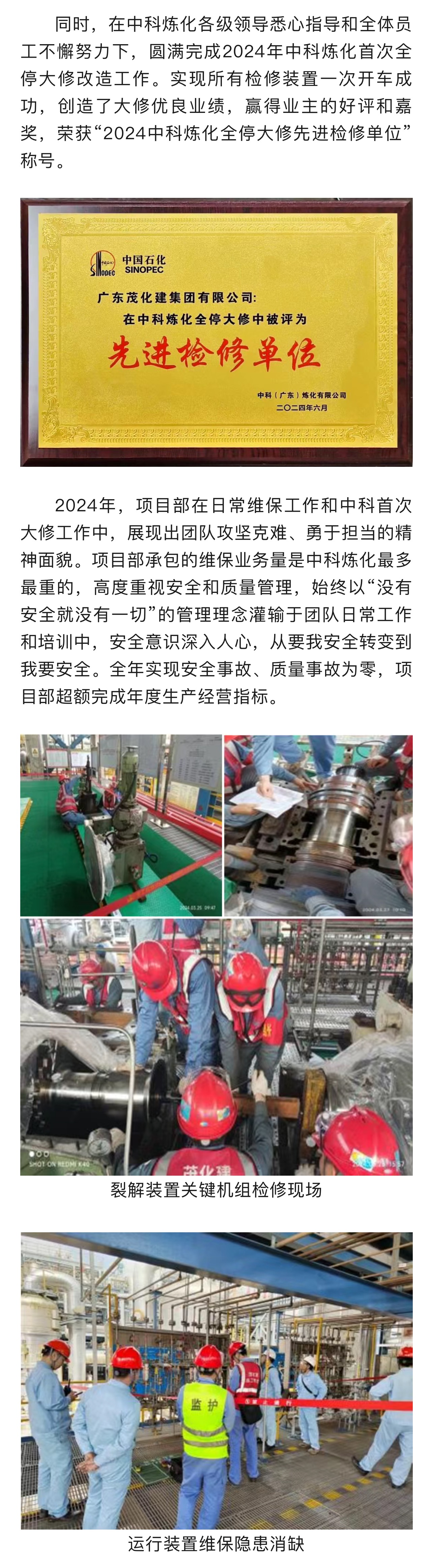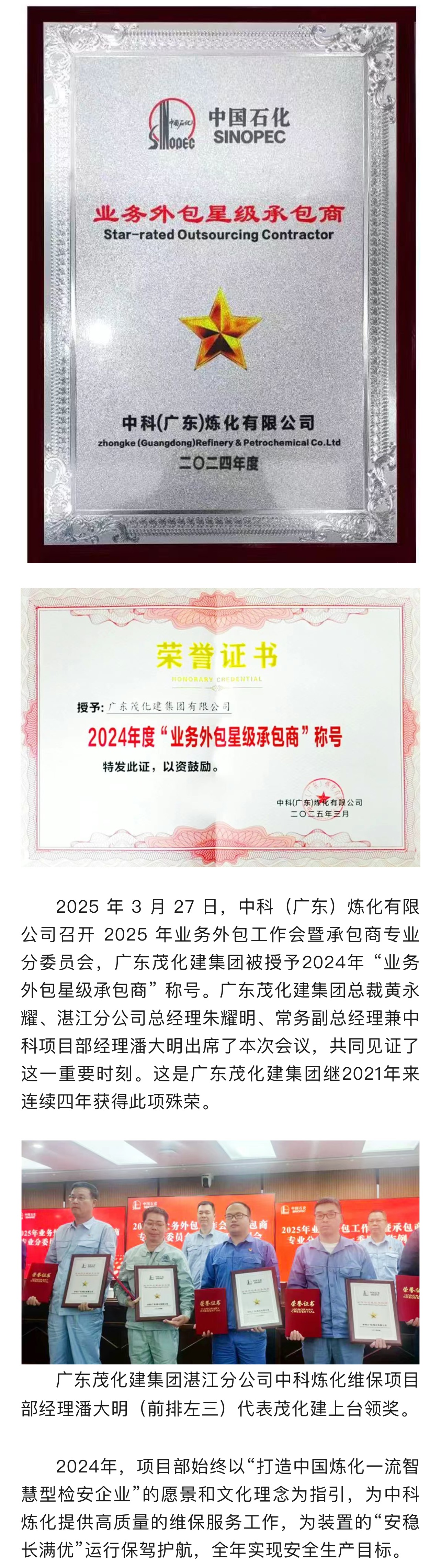 喜報(bào)|榮獲2024年中科煉化 “業(yè)務(wù)外包星級承包商”稱號